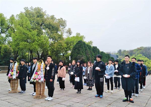 在烈士紀(jì)念碑前,師生們敬獻花籃、齊唱國歌,向革命先烈莊重地三鞠躬。
