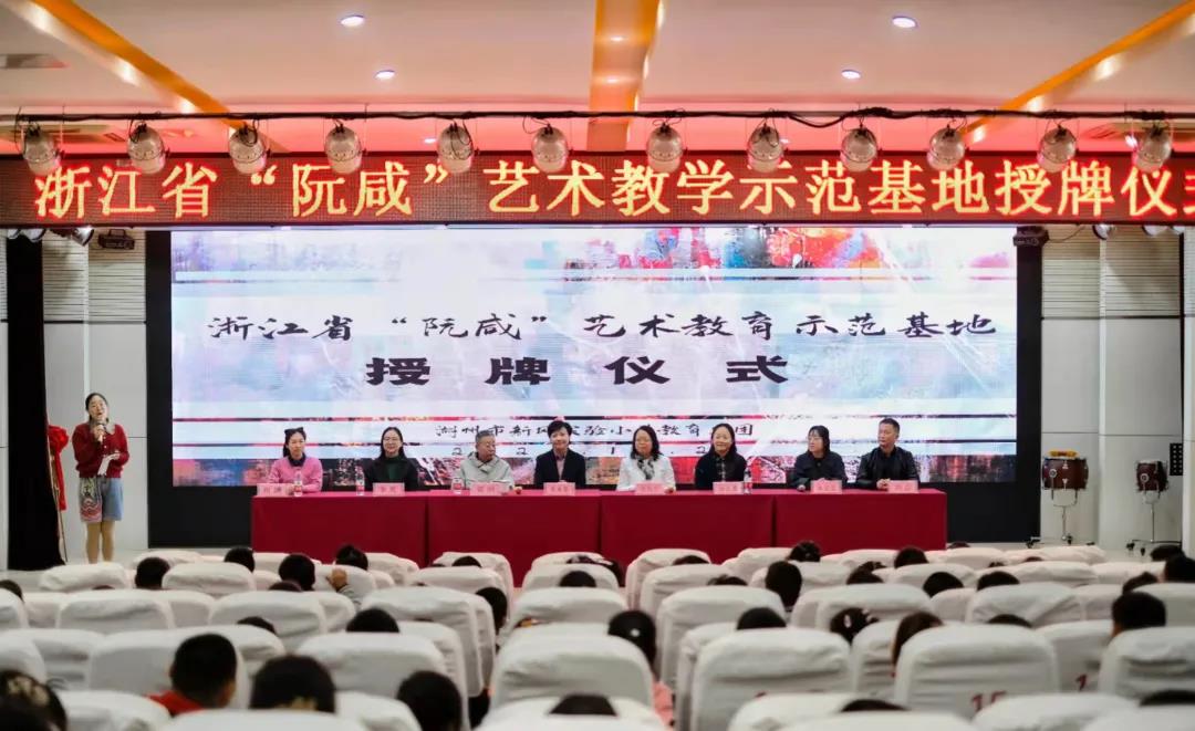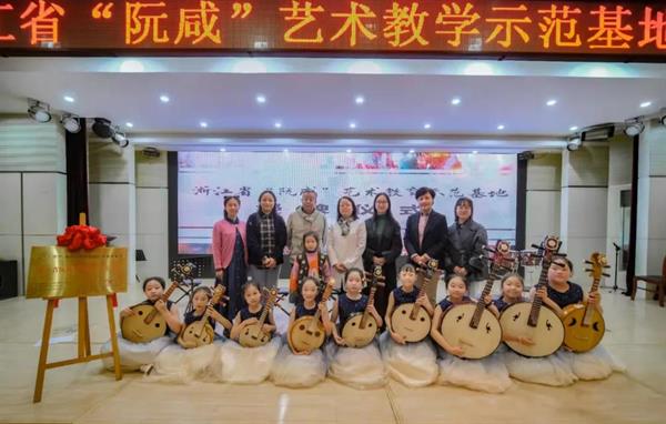 10月20日科研團隊負責人、浙江省民族管弦樂學會阮專業(yè)委員會會長祝杭紅,浙江省民族管弦樂學會阮專業(yè)委員會副會長陸沁凝與湖州市音樂家協(xié)會主席、湖州文化館副館長裘鋼,吳興區(qū)音樂美術教研員李夏老師前往湖州市新風實驗小學,對該校的阮咸特色打造、教學內(nèi)容、師資配備等進行嚴格評估和審核,授予該校“浙江省阮咸藝術教學示范基地”稱號,并進行了授牌儀式。