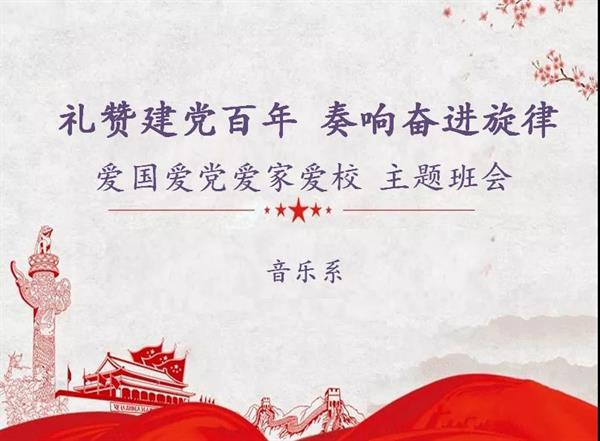 結(jié)合黨史學(xué)習(xí)教育,進(jìn)一步教育學(xué)生銘記歷史,勿忘國恥,永遠(yuǎn)跟黨走,增強(qiáng)全系學(xué)生傳承紅色精神的自覺性和自信心,根據(jù)音樂系黨總支關(guān)于《“禮贊建黨百年 奏響奮進(jìn)旋律”音樂系黨總支慶祝中國共產(chǎn)黨成立100周年系列活動(dòng)方案》,音樂系各班開展“愛黨愛國愛家愛校”主題班會(huì)。