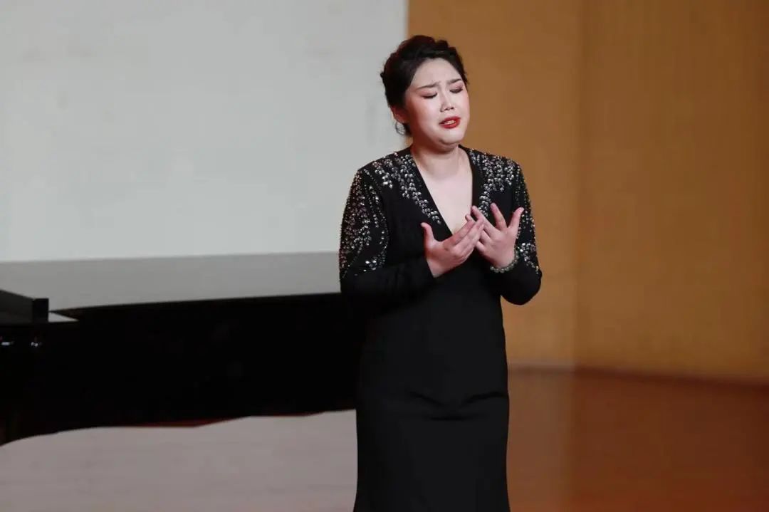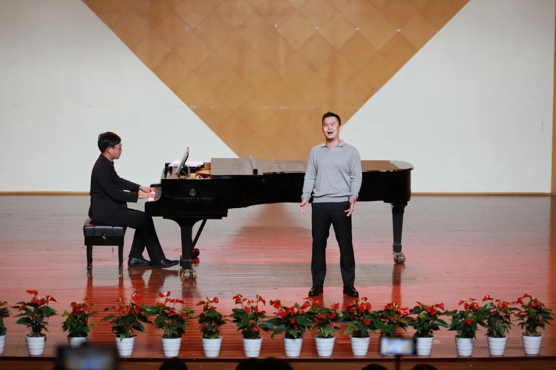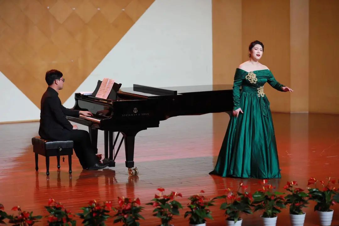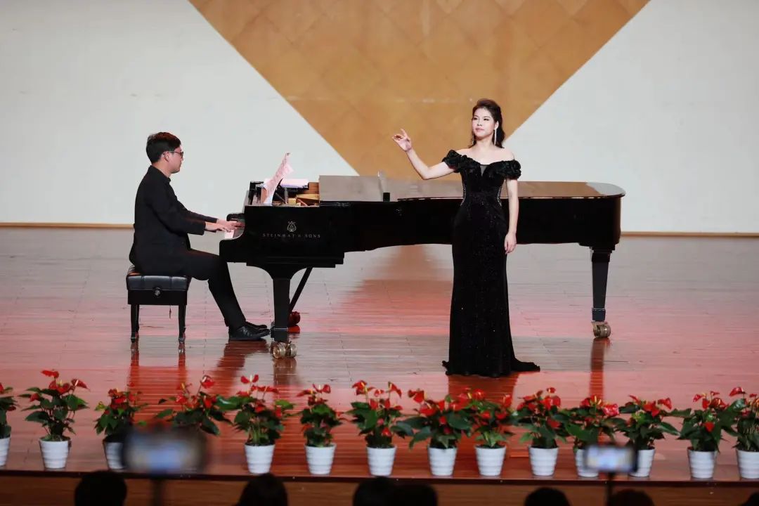 音樂(lè)會(huì)在熱烈的掌聲中拉開帷幕,本場(chǎng)音樂(lè)會(huì)共有十五首曲目,曲目種類豐富、風(fēng)格多樣。兩位同學(xué)以其飽滿的情感、精湛的演唱技巧輔以鋼琴再現(xiàn)了聲樂(lè)藝術(shù)的有聲維度,以及經(jīng)典作品中深厚的中華文化底蘊(yùn),唱出了喜慶二十大,實(shí)現(xiàn)第二個(gè)百年奮斗目標(biāo)的信心和決心。本場(chǎng)音樂(lè)會(huì)特邀青年鋼琴家,音樂(lè)學(xué)院青年教師熊壯壯擔(dān)任藝術(shù)指導(dǎo),特邀青年男中音,音樂(lè)學(xué)院21屆優(yōu)秀畢業(yè)生周余億強(qiáng)擔(dān)任助演嘉賓。兩位學(xué)生的專業(yè)教師朱卓凡登臺(tái)演唱一曲《奇妙的和諧》,為音樂(lè)會(huì)傾情助力。