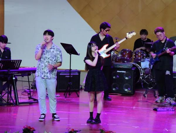 平日里以演奏樂器見長的流行音樂專業(yè)的同學(xué)們,在這場音樂會中向在座的師生們充分展示了自己的歌唱天賦,甚為吸睛。20流行鍵盤專業(yè)的姜美善同學(xué)為大家?guī)砹恕督稀贰缎淖觥穬墒罪L(fēng)格迥異的歌曲,充分顯露了她駕馭不同類型作品的能力。《江南》還特邀到了民樂專業(yè)王欣府同學(xué)的友情助力,悠遠(yuǎn)深長的簫聲從遠(yuǎn)處蔓延開來,瞬間點(diǎn)亮了整首歌曲,成為音樂會的一大亮點(diǎn)。素有“浙藝小吳青峰”美譽(yù)的19流行一貫林梓豪同學(xué)一改平日里揮灑自如的鼓手形象,化身為深情款款的情歌王子,為大家?guī)砹艘磺段液孟肽恪贰W鳛?021浙藝“十佳歌手”的主持人李佳怡則一改往常懷抱一把木吉他的恬靜形象,可甜可鹽的她聯(lián)袂葛晨同學(xué)為大家?guī)チ四信晫Τ枨断氚盐页o你聽》,贏得了現(xiàn)場熱烈掌聲。