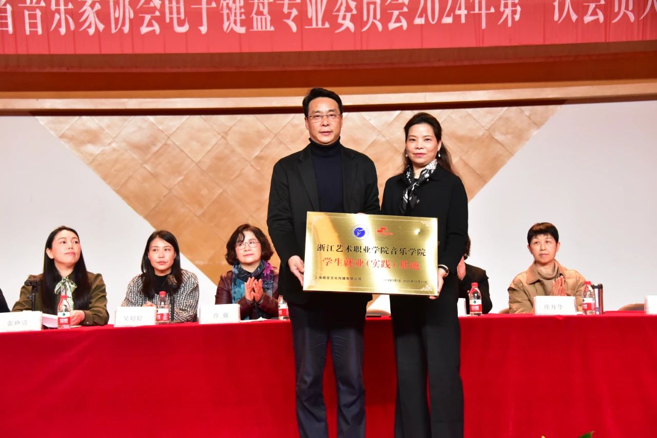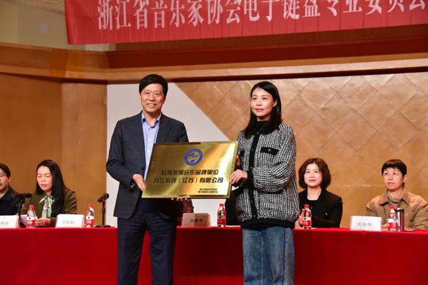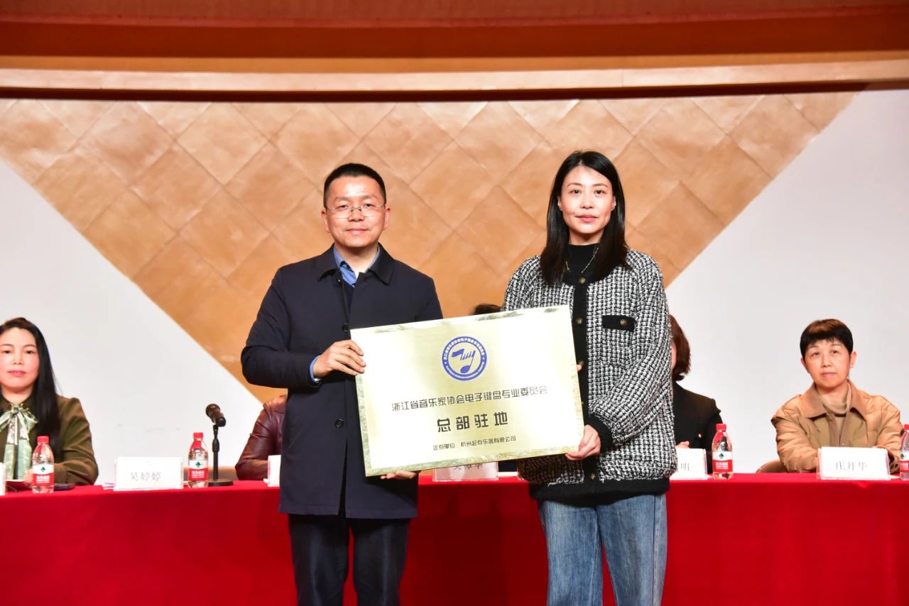 吳婷婷主任為吟飛科技(江蘇)有限公司頒授浙江省音樂家協(xié)會電子鍵盤專業(yè)委員會教育發(fā)展合作品牌單位匾牌;杭州起點樂器有限公司頒授總部駐地匾牌。同時,主席團(tuán)為本屆常務(wù)理事和理事頒發(fā)聘書