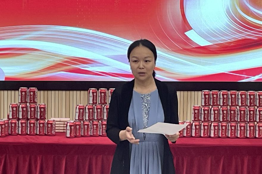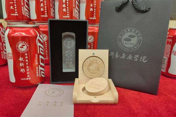 會場臺上擺放了為高考學(xué)生定制的助力可樂、U盤等。